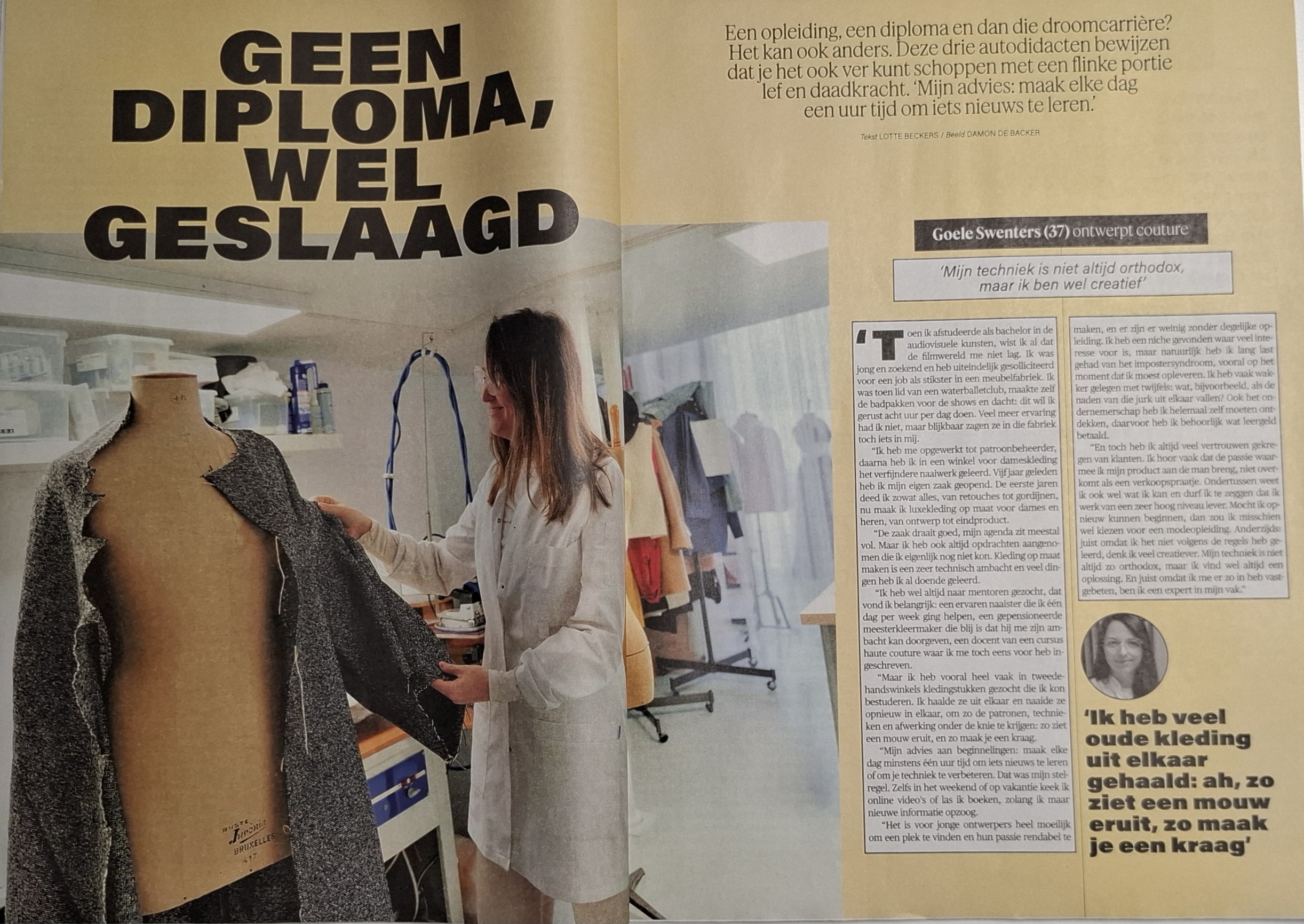 Op 14 februari 2026 verscheen in De Morgen Magazine een artikel over Goele Swenters, oprichtster van Maison Golia in Hasselt. Journalist Lotte Beckers belicht haar parcours als autodidact en hoe haar eigenzinnige weg uitgroeide tot een succesvol coutureatelier in Limburg.
